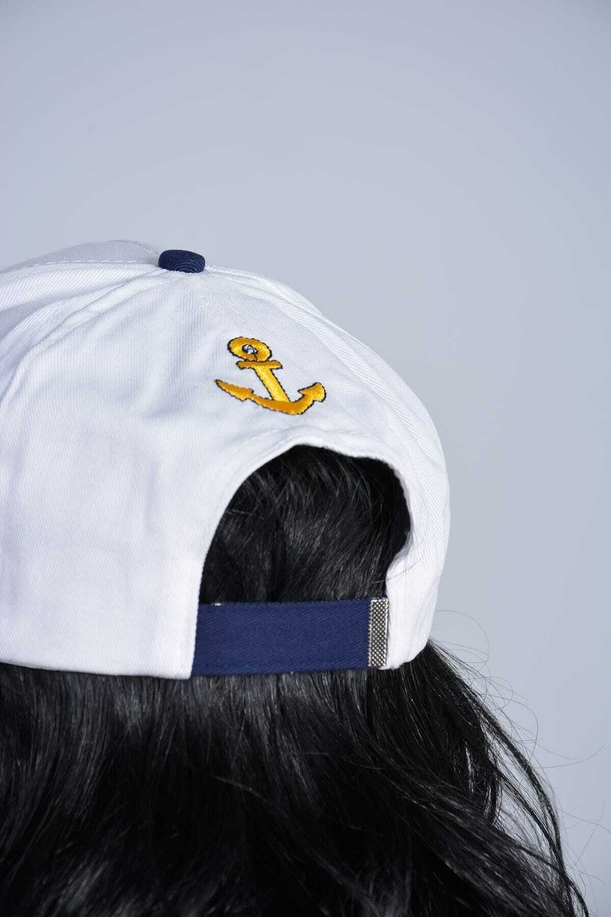 Es besteht aus hochwertigem Baumwollstoff. (Weiß - Marineblau) Einstellfunktion für eine einfache und bequeme Passform auf Ihrem Kopf. Sailor Anchor Crest (Stickerei Stickerei Produkt