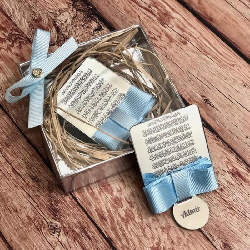 Von Mevlut bis Ameen und Hajj sind Ayatul-Kursi-Rahmen ideale Geschenke für Ihre Gäste. Diese sorgfältig mit Bändern verzierten Rahmen sind nicht nur Geschenke, sondern Zeichen der Wertschätzung für die Teilnehmer. Die personalisierte Ayatul-Kursi-Gravur verleiht eine zusätzliche Note der Dankbarkeit und Erinnerung.