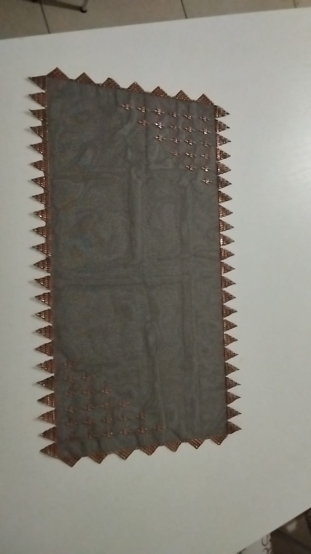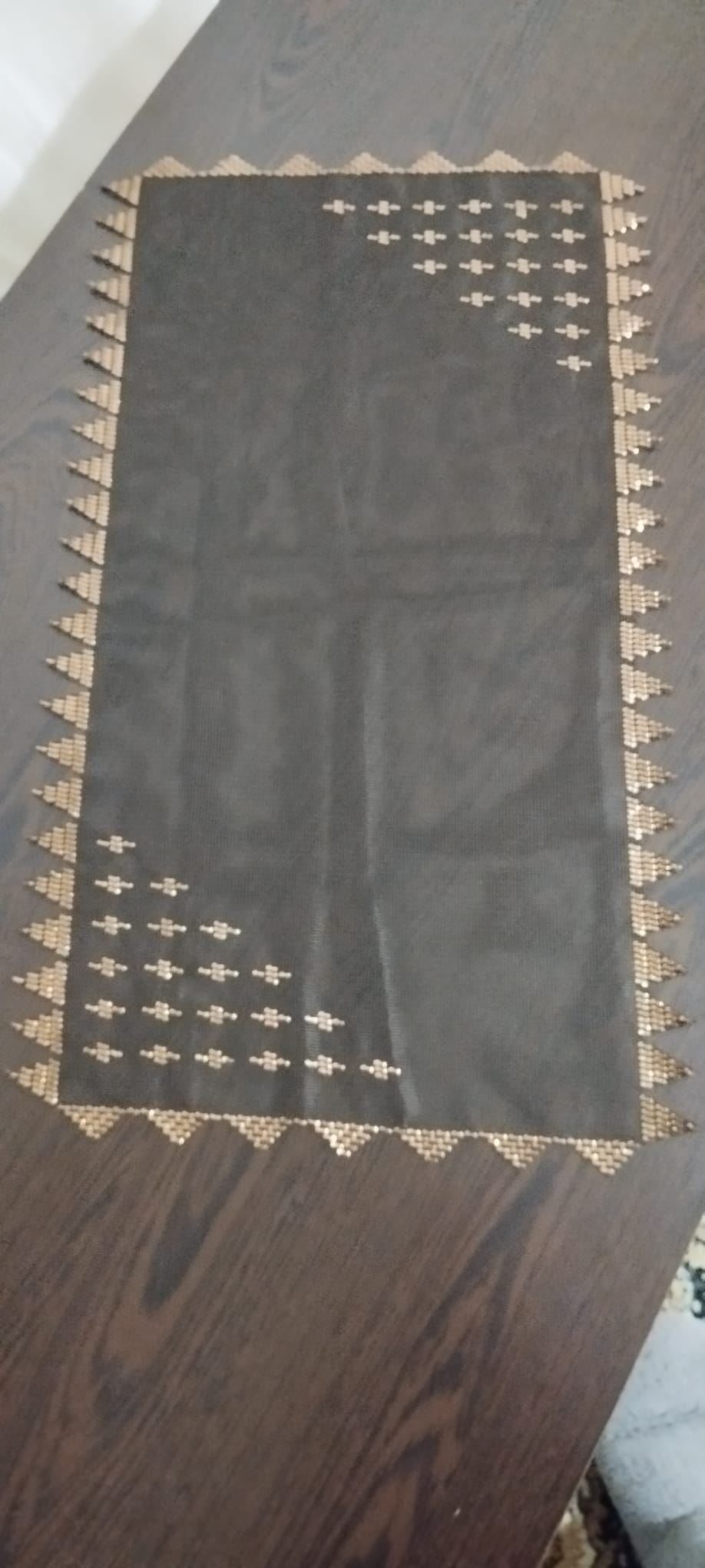 Kahverengi tül üzerine bakır renkli tellerin işlenmesiyle yapılmıştır. Konsol üzerinde veya küçük sehpalar üzerinde kullanıma uygundur.