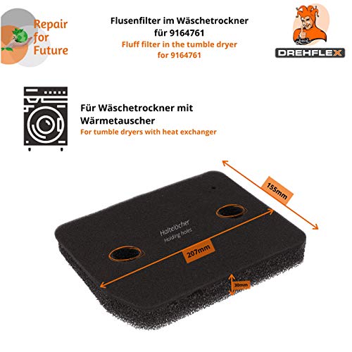 Details: Foam filter. For manufacturers: Miele. For devices: Foam filter / base filter. Tumble dryer, heat pump dryer. With heat exchanger. Item Name: Foam filter / replacement filter / foam filter / filter mat / sponge filter. For part number: Miele. 9164761. Replaces 9164760. Additional information: Size: Approx. 207 mm x 155 mm, height approx. 30 mm. Can also be cut to size if required. 2 large holes (approx. 24 mm diameter) and a smaller hole at the top side (approx. 5 mm diameter) are available to mount them in the bracket before the heat exchanger. Function: This filter is mounted directly before the heat exchanger of the tumble dryer to filter lint so that the heat exchanger does not clog up with it. This ensures a longer service life of the dryer. Replacement: The filter, which is made of foam, can be washed out again and again under running water. However, if the foam filter is broken, it should be replaced immediately so that fewer lint comes into the heat exchanger for a longer life of the tumble dryer. Open the flap before heat exchange (at the bottom of the base - often recess in the flap to press on) - this jumps out on the base filter on the handle. You can then remove the foam filter from the handle rod – so you can clean the filter or replace the filter. You can learn more in the instructions of your device. Box contents: 2 x foam filters. In case of uncertainty, please contact the seller before using the device data - these can be found on the name plate of your device when you open the door.