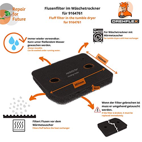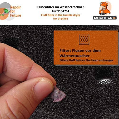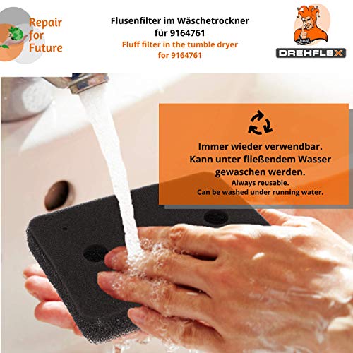 Easy to replace: the filter, which is made of foam, can be washed out again and again under running water, but if the foam filter is broken, it should be replaced immediately so that less lint comes into the heat exchanger for a longer service life of the tumble dryer